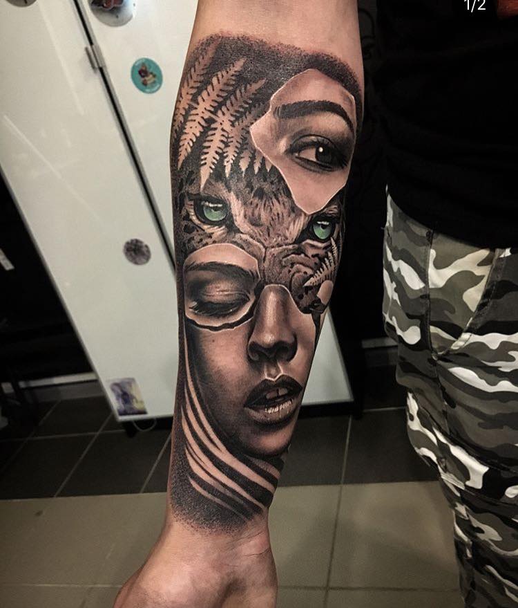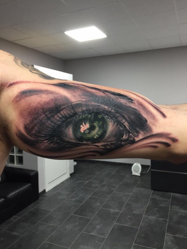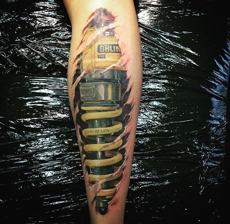 Biomechanik. Das ist, was viele als 3D Tattoos bezeichnen. Dabei ist es nichts anderes, als ein Foto von einem Stoßdämpfer übertragen auf Haut und gestochen im Farbrealismus. Klingt einfacher, als es ist. Machen wir aber besonders gerne.