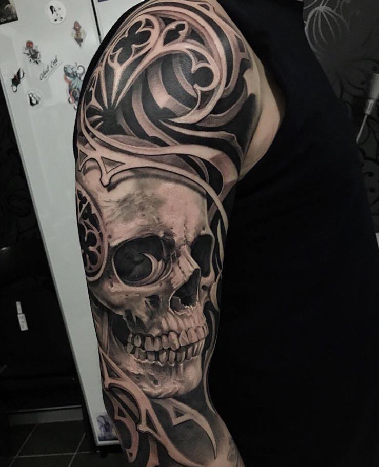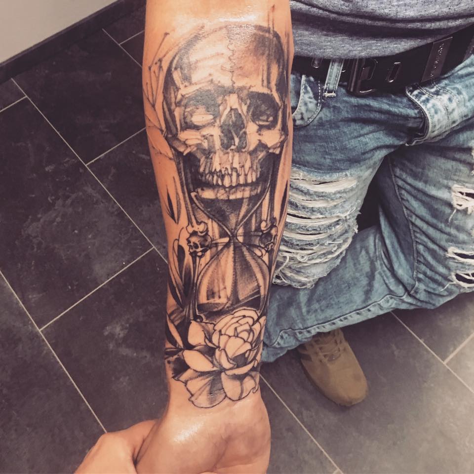 Totenkopf mit Sanduhr. Ein Mix aus verschiedenen Stilrichtungen - Black and Grey Realism, Abstract und Sketching.