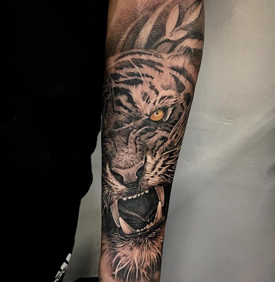 Sehr gelungener aggressiver Tiger in Black and Grey mit einem Farbakzent in den Augen. Eine Session.